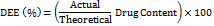 Gastro spheres equivalent to 5 mg of carvedilol was taken and was crushed using pestle and mortar. The crushed powders of drug containing gastro spheres were placed in 25 ml of 0.1N HCl and kept for 24 h with occasionally shaking at 37+/-0.5 ◦C. After the stipulated time, the mixture was stirred at 500 rpm for 20 min using a magnetic stirrer (Remi Motors, India). The polymer debris formed after the disintegration of gastro spheres was removed filtering through Whatman® filter paper (No. 40). The drug content in the filtrate was determined using a UV-VIS spectrophotometer (LabIndia) at 280 nm against appropriate blank. The drug entrapment efficiency was calculated using the following formula.
