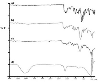 Fig. 3: IR Spectras of a) Carvedilol b) Carvedilol+SCMC c) Carvedilol+SCMC+NA. Alginate d) Formulation F5