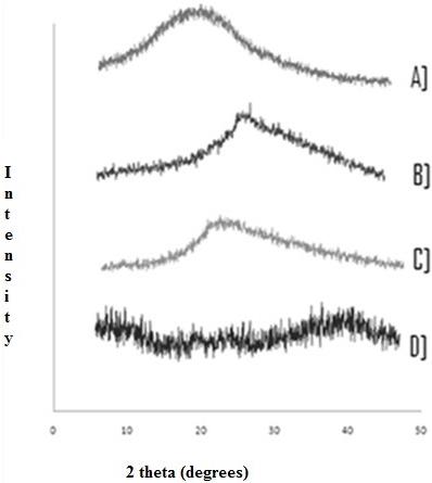 Fig. 4: X-Ray diffraction Spectras of A) Carvedilol B) Carvedilol+SCMC C) Carvedilol+SCMC+NA. Alginate D) formulation F5