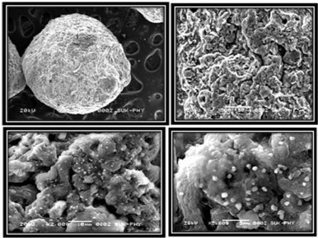 Fig. 6: Scanning electron photograph of drug loaded Gastrosphere (Magnification, X65, X500, X2000, and X5000)