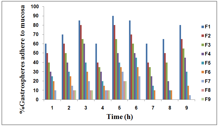 The in vitro mucoadhesive test using goat intestinal mucosa for assessing mucoadhesivity of gastro spheres containing carvedilol was performed in 0. 1N HCl for 8 h. The percentage of gastro spheres adhering to the goat intestinal mucosal tissue varied from 10% to 20 % over 8 h (fig. 7). Less mucoadhesion of gastro spheres containing carvedilol may be due to the reason that at lower concentration the polymer structure is looser and the polymer chain have more space to extend within the mucus, as the number of polymer chains penetrating in mucus is increased a strong bond, either chemical, mechanical or both is formed between the mucus and the polymer [8]. Amongst all nine batches F5 batch gives more mucoadhesive property.