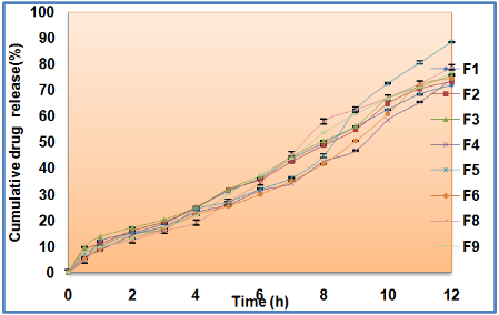 Fig. 8: In vitro drug release from various Carvedilol gastro spheres prepared through ionotropic gelation [mean+/-SD, n = 3]