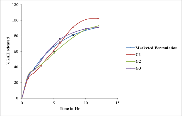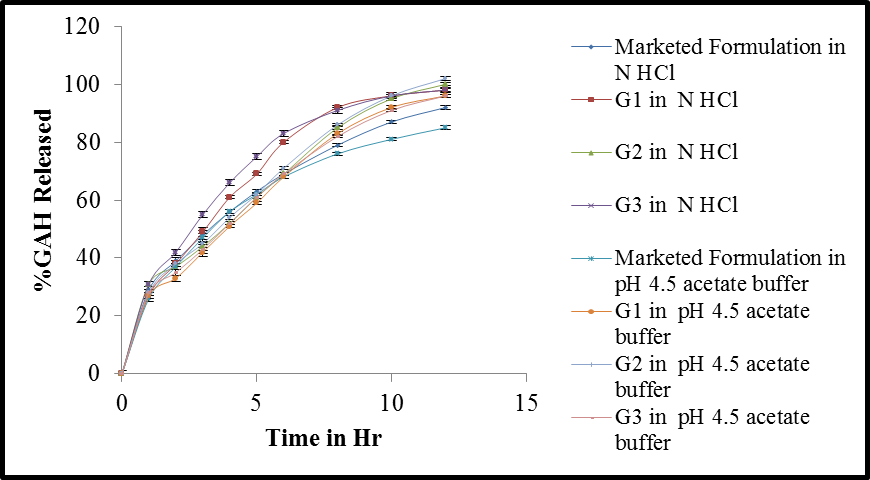 The drug release of GAH from the formulations under investigations and the reference formulation was further studied in two different dissolution medias viz 0.1 N hydrochloric acid and pH 4.5 Acetate buffer in order to study the impact of pH of dissolution medium on the rate of drug release. The data is shown in fig. 2.