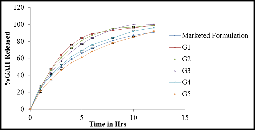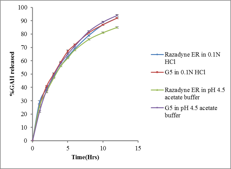 The drug release of GAH from the formulation G5 and the reference formulation was studied in two different dissolution medias viz 0.1 N hydrochloric acid and pH 4.5 acetate buffer in order to study the impact of pH of dissolution medium on the rate of drug release. The data is shown in fig. 4. The reference formulation shown pH-independent release of the drug while the formulation G5 shown slightly increased the rate of drug release in pH 1.2. The reason could be due to the property of HPC which is prone for hydrolysis in acidic pH.