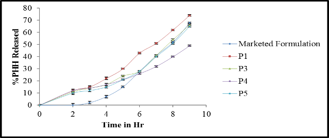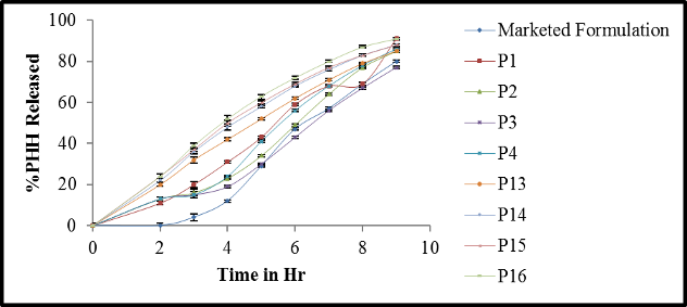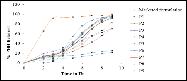 Fig. 5: Comparative PHH release profile between test formulations (P1-P9) and reference formulation (Paddle 150RPM)$