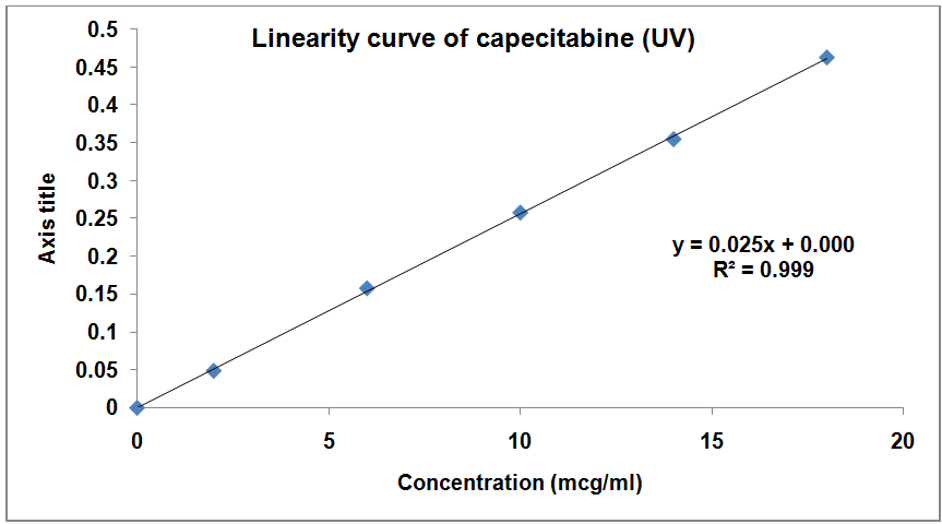 Conclusion: Both the methods developed were validated according to the ICH guidelines. Hence it was evident that the developed methods were novel, sensitive, precise and reliable for estimation of Capecitabine in bulk and were successfully applied for estimation of pharmaceutical dosage forms.