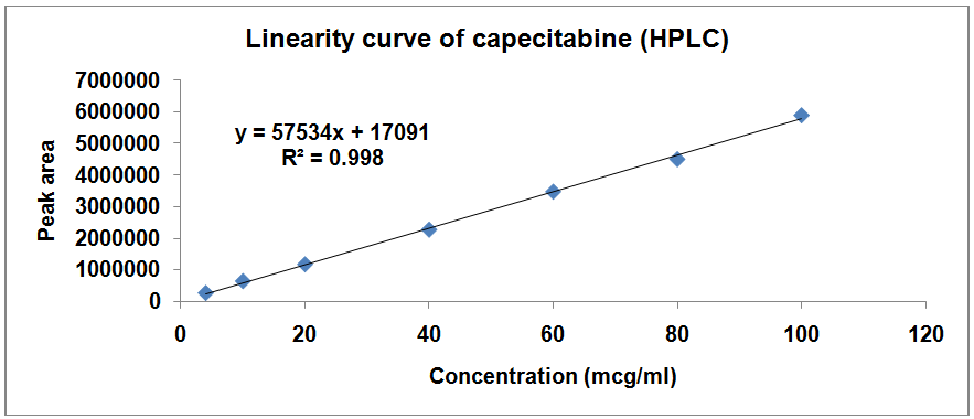 Capecitabine (CPTB) is a new, orally administered, enzyme-activated fluoropyrimidine carbamate belonging to the class antimetabolites. The drug is official in the Indian Pharmacopoeia (IP)[1, 2]. The chemical name of Capecitabine is 5-deoxy-5-fluoro-N-(pentyloxy) carbonyl]–cytidine with a molecular formula C15H22FN3O6 and molecular weight 359.35[3, 4]. The chemical structure is intended to generate high levels of fluorouracil (5-FU) in tumor cells located in the colorectal and breast region. Capecitabine is a prodrug of 5-deoxy-5-fluorouridine (5-DFU), which undergoes enzymatic conversion to be 5-fluorouracil [5-FU] in tumor cells [5, 6]. The 5-FU inhibits the synthesis of thymidine monophosphate, which is an active form of thymidine required for de novo synthesis of Deoxy Ribo Nucleic acid [7-10]. The empirical formula of the functional moiety is C15H22FN3O6. The active moiety acts by mimicking as a normal cell nutrient which is indispensable to the growth of cancer cells. Literature survey disclosed that there are few analytical methods for spectrophotometric [11] and chromatographic estimation of capecitabine [12-16].