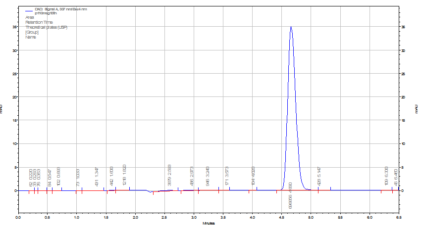 Chromatographic separation was achieved using mobile phase methanol: acetonitrile: water at a ratio 30: 30: 40. A flow rate of 1 ml/min was maintained throughout the separation process. Run time pressure of 2140 psi was maintained. All the contents of the mobile phase were filtered through a 0.45 mm membrane filter and degassing was performed using ROHS sonicator to remove dissolved gases if any. For each trial, 20 µl samples were injected manually, and a total run time of 6 min was maintained. The eluent was detected at 304 nm. Various systems suitability parameters were assessed as mentioned in table 1.