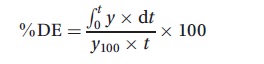 Percentage dissolution efficiency (%DE) of a pharmaceutical dosage form can be used to characterize drug release profiles. DE is defined as the area under the dissolution curve up to a certain time, t, expressed as a percentage of the area of the rectangle described by 100% dissolution. DE can be calculated by the following equation: