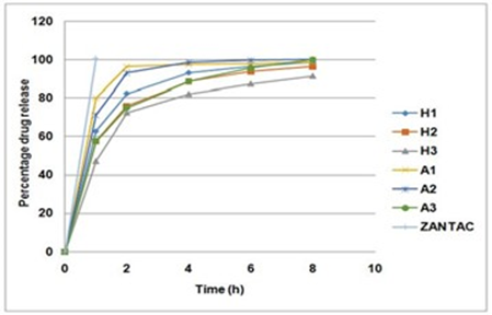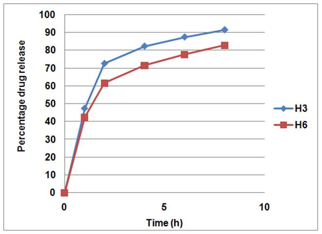 Fig. 4 shows the effect of PVP K90 on the release of ranitidine HCl from floating micro particulates prepared using hydrogenated castor oil (H6), pointing out a remarkable reduction in release pattern of the drug from the floating micro particulates. The combined effect of Aerosil® and PVP K90 as retarding agents is shown in fig. 5. H8 showed a relatively lower release of the drug compared to H3. However, no remarkable difference could be observed between the combined effect (H8) and the single effect of either Aerosil® alone (H4) or PVP alone (H6) (fig. 1-5).