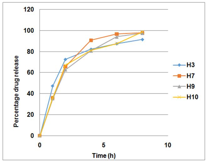 Incorporation of Aerosil® 200 (hydrophilic colloidal silicon dioxide) in the floating micro particulates (H7, H9, H10) affected the release of ranitidine HCl only in early stage (1 and 2 h), as it could decrease burst release of the formulation (fig. 2). The decrease in release in the early time points could be due to the interaction of similar groups on the surface of different particles of colloidal silicon dioxide via chemical bonds with each other to form connecting bridges. This, in turn, leads to the immobilization of dissolution medium and gel layer formation which could reduce burst effect at early points. The relatively slight increase in dissolution afterward could be due to the disintegration effect of hydrophilic colloidal silicon dioxide [18].