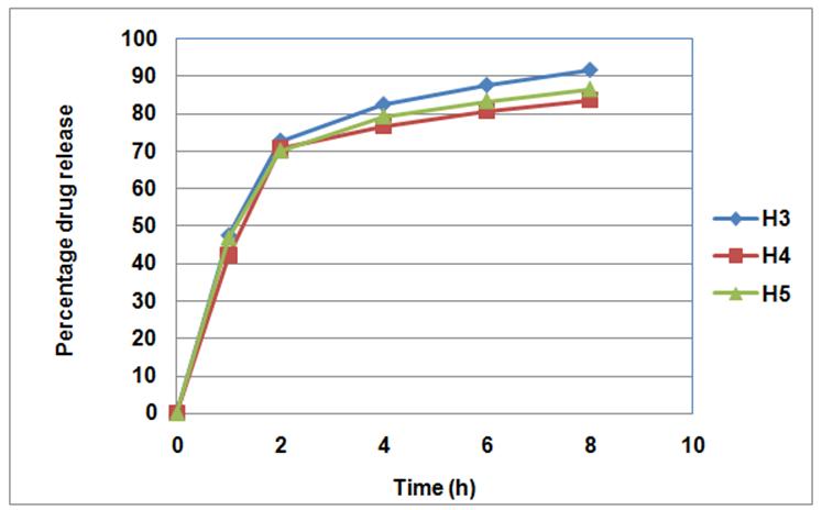The effect of ethyl cellulose as a release retarding agent is illustrated in fig. 3. Formulations containing ethyl cellulose (H4 and H5) showed a relatively slower drug release compared with the formulation devoid of ethyl cellulose (H3). The retardation is mainly observed starting from 2 h till 8 h following the initiation of the release study. Contrary to what was expected, the lower proportion of ethyl cellulose (H4) resulted in a relatively greater retarding effect compared with (H5) containing the higher proportion of ethyl cellulose (fig. 3). It could be suggested that increasing the proportion of ethyl cellulose (H5) may result in increasing the porosity of the prepared particles resulting in enhanced release compared with (H4) [11].
