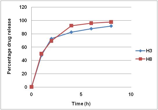 Fig. 5: In vitro release data of ranitidine HCl from floating micro particulates prepared using hydrogenated castor oil with and without the addition of PVP K90 and Aerosil® 200 combinations (H3, H8) in 0.1 N HCl (n=3) (average±SD)