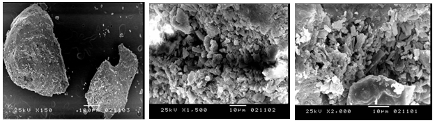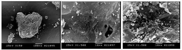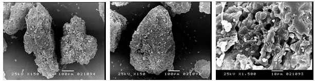 The surface morphology of some selected formulations as examined by SEM is shown in fig. 6-8. Microparticulates exhibited in general pores of variable intensities. The surface of (H9) appears to show flakes that could be of silicon dioxide (Aerosil® 200).