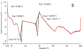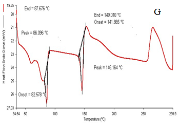 Fig. 10: Differential scanning calorimetry (DSC) thermograms of ranitidine hydrochloride (A), Cutina HR (B), PVP K90 (C), ethyl cellulose (D), ranitidine floating microparticulates H5 (E), ranitidine floating microparticulates H6, and ranitidine floating microparticulates H9 (G)