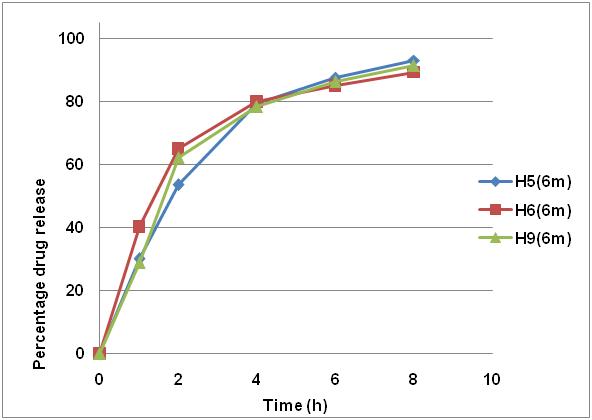 Fig. 11: In vitro release data of ranitidine HCl from floating micro particulates after 6 mo in accelerated stability study (H5, H6, H9) in 0.1 N HCl (n=3) (average±SD)