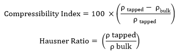 The compressibility index and the Hausner ratio were determined by measuring both the bulk volume and the tapped volume of powder. The compressibility index and Hausner ratio indicate the ease with which a material can be induced to flow and may be calculated using measured values for bulk density (ρbulk) and tapped density (ρtapped) as follows [13]: