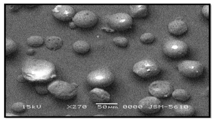The surface characteristic of the optimised batch (D10) was analysed by scanning electron microscope (SEM). The microspheres were placed on double-sided tape that had previously been secured on aluminium stubs, and the microspheres were observed by scanning electron microscope (JSM 6510 LV, JEOL DATUM Ltd., Japan) operated at a voltage of 10 kV and magnification of 3000x [24].