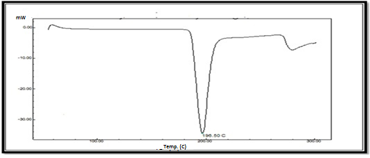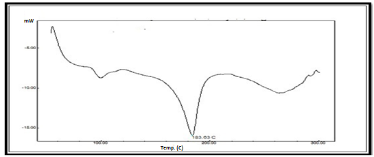 The thermogram of rizatriptan benzoate exhibited a sharp endothermic peak at 196.05 °C, signifying its melting point which was reported in the literature fig.2a. Characteristic peaks of rizatriptan benzoate were disappeared in the drug-loaded microspheres. This indicates that rizatriptan benzoate was uniformly dispersed and encapsulated in the polymeric microspheres show an ever peak of ethyl cellulose was observed at 183.63 °C fig. 2b.