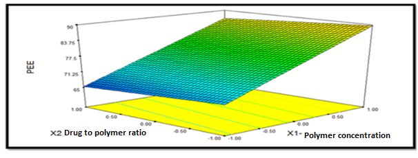 The results indicated that the concentration of polymer has a high positive impact on entrapment of the drug. Therefore with increased in concentration of polymer, PEE was also increased (fig. 4). The drug to polymer ratio had shown the negative impact on PEE; it may be due to a higher proportion of the drug in comparison with the polymer. The volume of light liquid paraffin, as well as the amount of stabilizer also, has shown negative effects on PEE. Further, the regression statistics showed that the R2value 0.9998, which indicates a good fit.