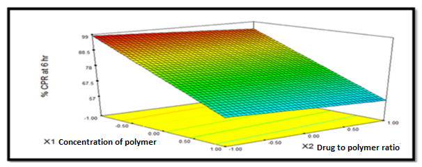 The concentration of polymer had a negative significant effect on % CPR after 6hdue to release retarding nature of polymer (fig. 5). Further increased in the proportion of drug with respect to polymer also reduced the release rate of rizatriptan benzoate. Hydrophobicity of magnesium stearate might also be responsible for retardation in drug release indicated by negative signs of the coefficient. The volume of liquid paraffin had a positive effect on drug release which might be due to larger volume available for the dispersion, resulted into a smaller size of microspheres with higher surface area. Further, the regression statistics showed that the R2value was 0.9424, which indicated a good fit.