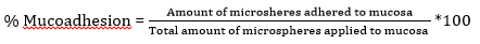 The mucoadhesive property of microspheres was determined by mucoadhesion apparatus (fabricated in the laboratory). For study purposes, the sheep nasal mucosa was isolated by cutting nose bone with the help of a bone cutting tool. Then mucosal portion was separated slowly from bone by using blunt forceps within 2 h of sacrifice and washed with isotonic saline solution. Accurately weighed the quantity of microspheres was placed on the mucous membrane, which was confiscated over a plate and phosphate buffer pH 6.6 (37 °C) was appended at a rate of 2 ml/min and flow was regulated by means of the burette. The percent mucoadhesion was determined by looking at the amount of microspheres adhered to the mucosa and total amount of microspheres initially applied to mucous. The percent mucoadhesion was calculated utilising the following equation after 2 h [21].