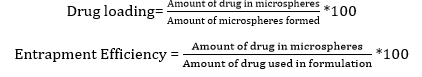 Fifty mg of microspheres was taken and crushed in a glass mortar and pestle. The resulting powdered microspheres were suspended in 50 ml phosphate buffer (pH 6.6). The mixture was stirred using the magnetic stirrer for 24 h. The solution was strained and the filtrate was analysed spectrophotometrically (UV 1800, Shimadzu, Japan) at 278 nm. The drug loading and entrapment efficiency (%) was calculated by applying the following equations [22, 23].