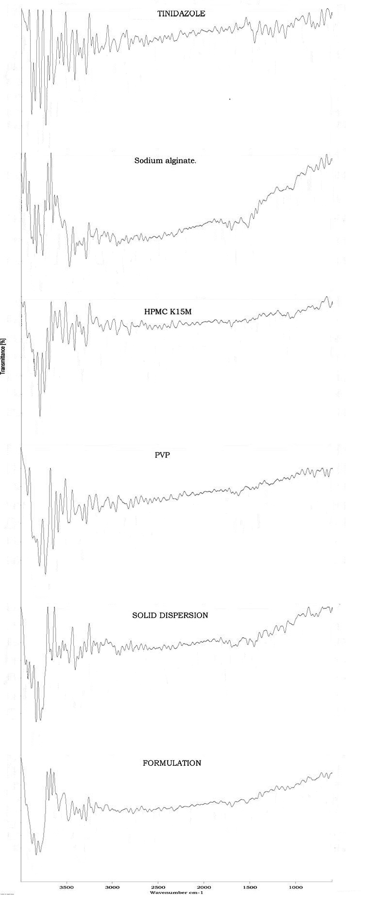 Fourier transform infra-red (FTIR) spectroscopy has been used to study the physical and chemical interactions between drugs and excipients. FT-IR spectra were recorded with FT-IR (ATR) spectrophotometer (Bruker Alpha E). Each sample grounded and mixed with potassium bromide (KBr) (Uvasol, Merck, and KgaA, Germany). Pellets were prepared by using a hydraulic press with a pressure of 100 Kg/cm2 for 15 min. The pellets were then scanned from 4000 to 400 cm-1 with a mirror speed of 2 mm/s. Drug-excipient compatibility study was carried out by FT-IR analysis of pure tinidazole, sodium alginate, HPMC, PVP, a solid dispersion of tinidazole, and a formulation containing tinidazole.