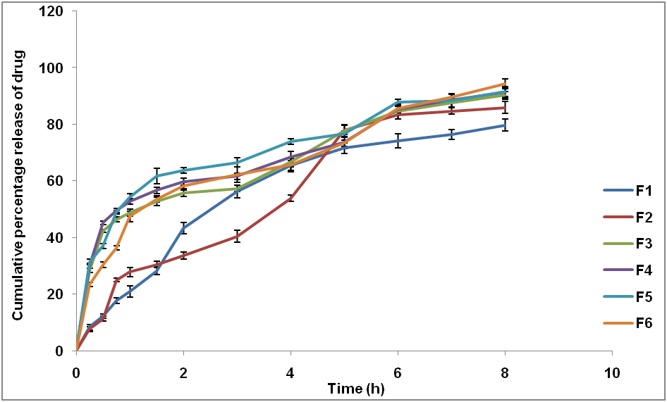 In vitro dissolution of tinidazole, raft forming tablets were carried out in 0.1 N HCl buffer solution under sink condition up to 8h. F1 and F2 shown a slow release initially, whereas F3, F4, F5, F6 has shown an initial burst release (data shown in table 4). This phenomenon is observed due to the presence of solid dispersed tinidazole in F3-F6 formulation. The cumulative release of drug was found to vary between 79.71±2.18 to 94.32±1.79 %. From the above result, it can be clearly said that the decrease in HPMC concentration is having a positive impact in drug release (fig. 2) due to variation in matrix strength of tablet formulation.