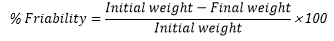 The friability of the prepared tablets was measured by “Roche” friabilator. 10 tablets were weighted and placed in the plastic chamber of friabilator and set for 25 rpm for about 4 min and the tablets were removed, de-dusted and reweighed. The percentage of friability was calculated as per formula [21].