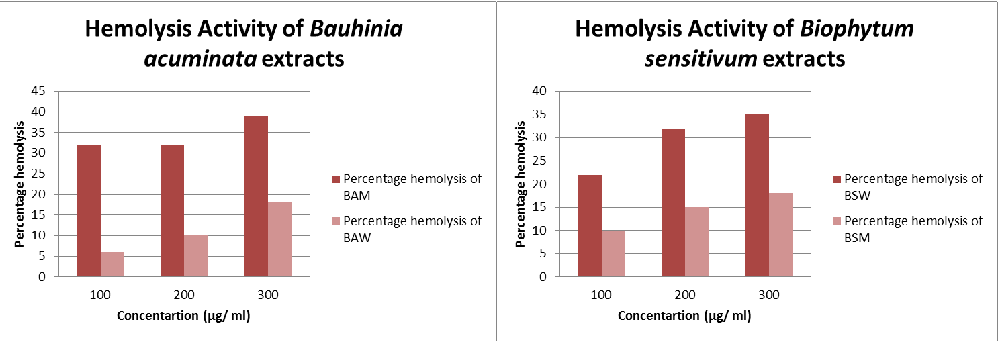 Haemolytic activity of leaf extracts of Bauhinia accuminata and Biophytum sensitivum and the nanoparticle (NP) extracts were performed to observe its toxic effects on human erythrocytes. The extracts showed low haemolytic activity. The percentage hemolysis was found in the range of 3%-6.7%. Thus, the extracts are found to be safe for human use.
