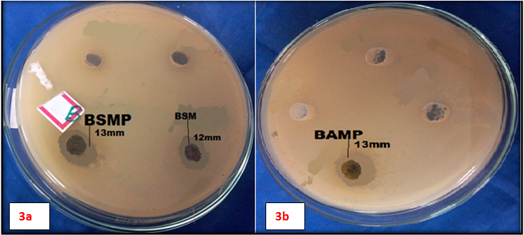 Fig. 3a: Antimicrobial activities of leaf extract and silver nanoparticle, 3b: Antimicrobial activity of plant leaf extract, Note: -BSMP-Biophytum sensitivum methanolic plant extract, BSM-Biophytum sensitivum silver nanoparticle, BAMP-Bauhinia acuminata methanolic plant extract