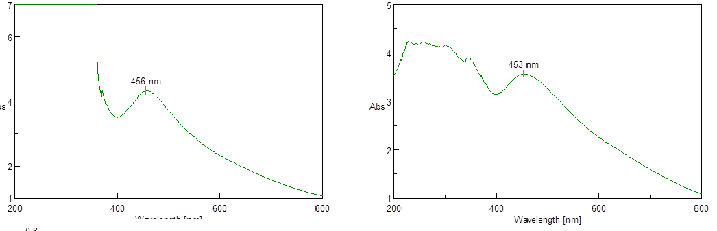 UV-Visible absorption spectra of the silver nanoparticles in solution were recorded. The UV-Visible spectra of plant-mediated (Bauhinia acuminata and Biophytum sensitivum) silver nanoparticles showed the excellent result. High peak of absorbance was observed between wavelengths of 400-460 nm. The uv-visible absorption spectrum of the silver nanoparticles in solution is shown in fig. 4.
