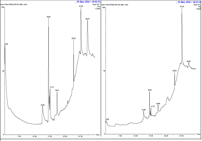 Fig. 5: GC-MS analysis of Bauhinia acuminata and Biophytum sensitivum methanol leaf extract