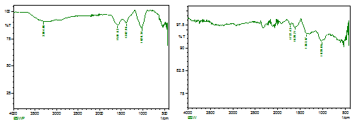 FTIR analysis was done for the characterization of the resulted leaf extracts and nanoparticle extracts of Biophytum sensitivum as it showed high activity. The FTIR absorption spectra of Biophytum sensitivum extracts of the plant as well as nanoparticles were found to be in a range of 981.77 cm-1–3317.56-1. These absorption bands correspond to various functional groups of amides, aromatic rings, nitro groups, esters, alkenes, aldehydes, amines, etc. The amide, carboxyl, hydroxyl, aromatic groups i. e, the phenols, saponins, terpenoids found in the plant extracts are responsible for the reduction and capping during the silver nanoparticle synthesis. The FTIR results of the plant and nanoparticle extracts are shown in table 2.
