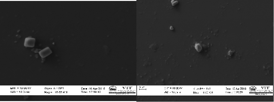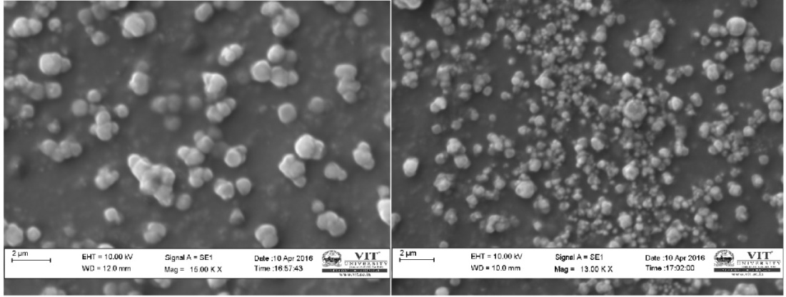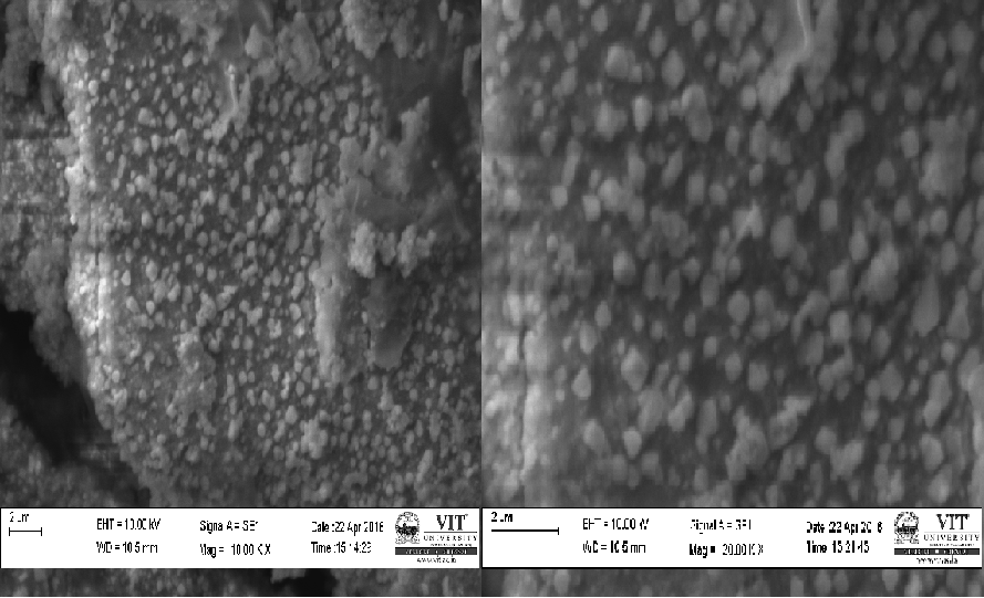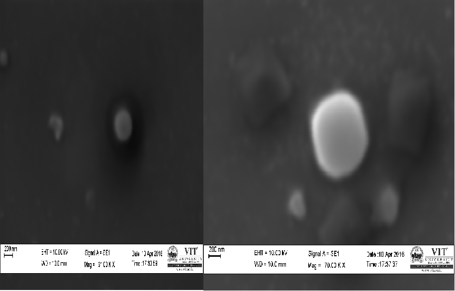 The resulted dried powder of silver nanoparticles by green synthesis was subjected for SEM analysis, to determine the particle size of formed silver nanoparticles. The samples were sputter coated using 60% of gold and 40% of palladium and the images of nanoparticles were studied under SEM using Zeiss (EVO18) [12].