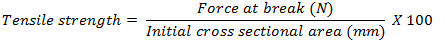 Tensile strength was determined using lab scale tensile strength to measure instrument. Films of dimension 3×2 cm2and free from physical imperfections were used for the study. The films were held between two clamps at a distance of 3 cm. Films were pulled by the upper clamp at the rate of 5 mm per minute until it tears with the addition of weight at regular intervals. Measurements were done in triplicate for each batch. Tensile strength is the ratio of maximum stress applied to a point at which the film specimen breaks and can be computed from the applied force at rupture to the cross-sectional area of the fractured film as a mean of three measurements and described in the equation: