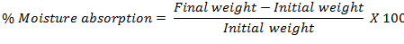 The moisture absorption capacity of the films was determined by exposing the pre-weighed films to 75±2% relative humidity (created by using a saturated solution of NaCl) in a desiccator at room temperature. Film samples were weighed at predetermined intervals until constant weight was achieved. Percentage moisture uptake was calculated as the percentage of the difference between the final and initial weight with respect to the final weight as per the following formula: