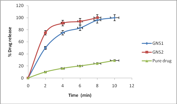 Fig. 3: In vitro dissolution profiles of GNS 1, GNS 2 and pure glimepiride inpH 1.2 HCl buffer