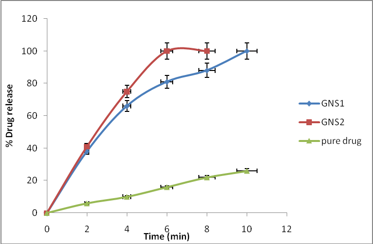 In vitro drug release studies were performed on USP-Type II Basket apparatus at 75 rpm in two dissolution media separately, 900 ml of pH 1.2 buffer and 900 ml of pH 6.8 phosphate buffer at 37.0±0.5 °C. TheHard gelatin capsules were filled with an accurately weighed quantity of pure glimepiride powder (2 mg) and GNS1 and GNS2 (equivalent to 2 mg of glimepiride) were used for dissolution. About 5 ml of sample was withdrawn at predetermined time intervals and replaced with an equal quantity of fresh dissolution medium. These samples were filtered through 0.45-μm Whatman filter paper and analyzed spectrophotometrically at λmax 227 nm. The in vitro dissolution testing studies were performed in triplicate.