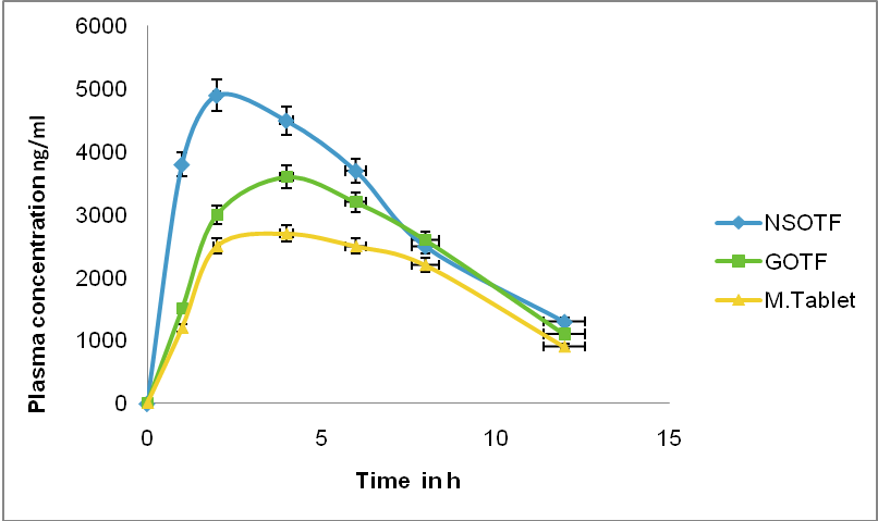 The differences in between the formulations were more evident during in vivo studies (table 4). Plasma concentration of glimepiride increased more rapidly in case of NSOTF than in GOTF and marketed tablets. The t-max was 2 h and Cmax was 4900ng/ml for NSOTF which was highest among all the three formulations, whereas marketed tablet showed lowest Cmax (2900ng/ml). Area under the curve (AUC) values calculated for 12 h from the plasma concentration of glimepiride by Trapezoidal rule. The values have significantly increased from 22650ng. h/ml to 27800 ng. h/ml by converting glimepiride into OTFs. This effect is due to the complete dissolution of glimepiride in the GI tract. Formulation NSOTF showed the highest AUC (37444 ng. h/ml) i.e. significant enhancement in bioavailability. Thus nanosuspension loaded OTFsis a better and novel option for improvement of bioavailability with a faster onset of action of poorly soluble drugs.