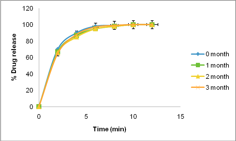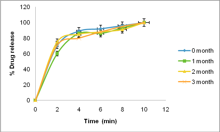 From stability studies of OTFs (table 5) it was observed that the physicochemical properties were retained within the specified limits i.e. films were transparent visually, and percent moisture absorption increased from 9.35 to 10.27 % which did not affect the ease of handling of the film as well as folding endurance was also within limits. Film disintegrated within 28 sec and % drug content decreased from 98.03% to 96.78% within 3 mo at 40 °C/75%RH. There was no significant difference in % dissolution of the drug in 1.2 as well as 6.8 pH (fig. 8 and fig. 9).