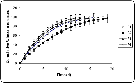 Fig. 3: In vitro release studies of insulin implants in PBS (7.4) at 37 °C, n=3, Data presented as mean±SD