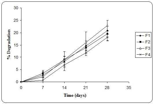 Fig. 4: Degradation studies of the implants F1, F2, F3 and F4, n=3, Data presented as mean±SD