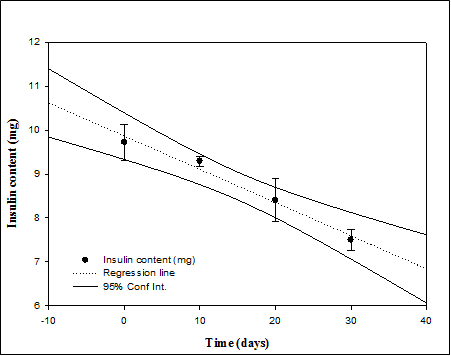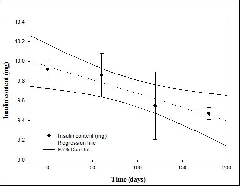 Observations under long-term storage conditions and accelerated conditions are shown in the fig. 5 and 6. The insulin content in the formulation in long-term storage conditions and accelerated storage conditions along with 95% confidence limits were plotted (sigmaplot version 9.0). When the implants were stored under long-term storage conditions the insulin content in formulation F2 was found to be 9.47±0.06 mg (94.7% of the initial content) after six mo. Under accelerated conditions, the insulin content was 7.50±0.23 mg (75% of the initial content). These results suggest that at any time (either during transit or storage) the insulin implants should be stored at refrigerator temperatures.