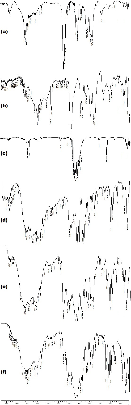 Fig. 1: FT-IR Graphs of a) eudragit S 100; b) eudragit L 100; c) Mg stearate; d) mesalazine; e) mesalazine+eudragit S 100; f) mesalazine+eudragit L 100