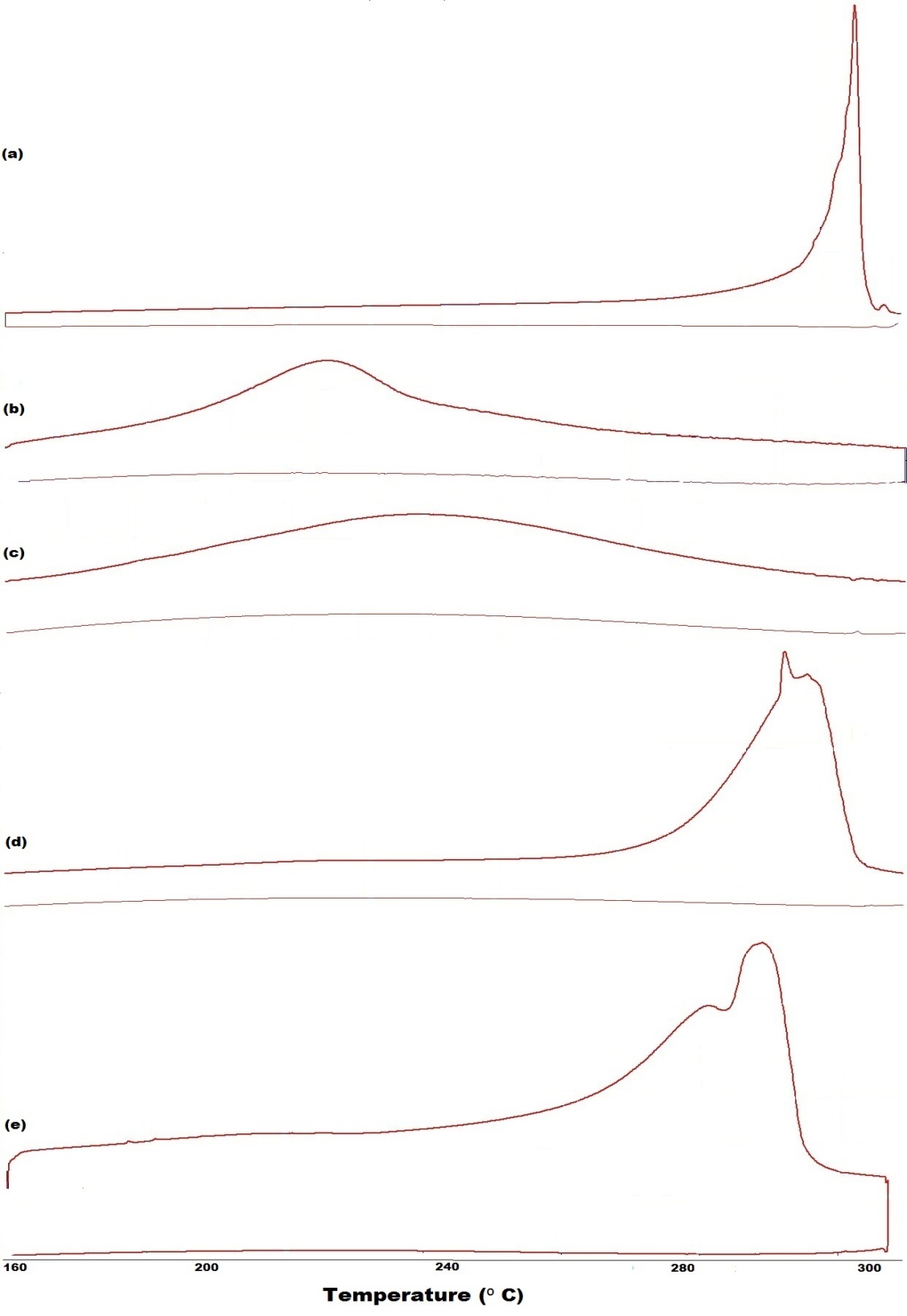 Fig. 2: DSC Curves of a) mesalazine; b) eudragit L 100; c) eudragit S 100; d) mesalazine+eudragit S 100; e) mesalazine+eudragit L 100