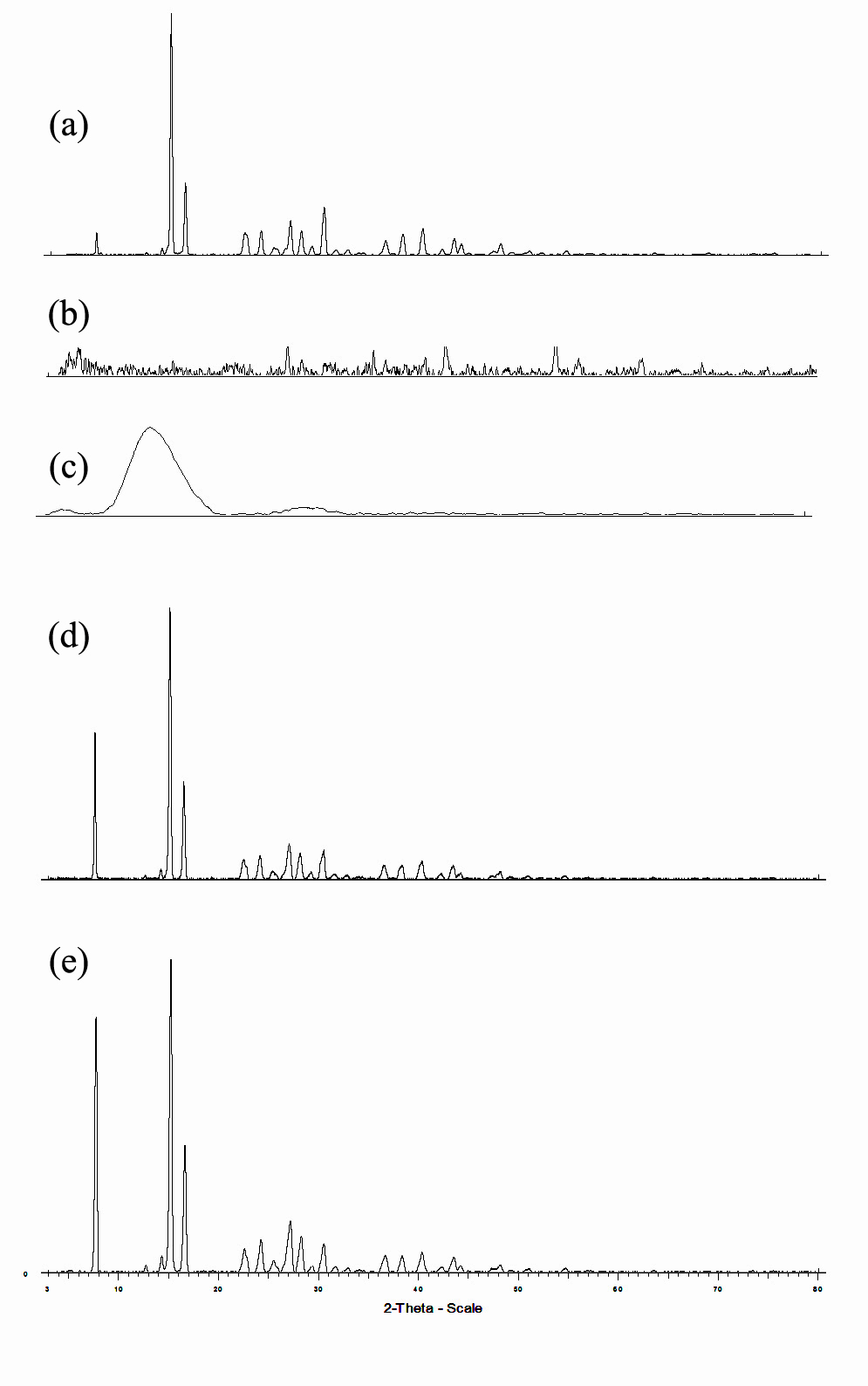 Fig. 3: XRD Curves of a) mesalazine; b) eudragit L 100; c) eudragit S 100; d) mesalazine+eudragit S 100; e) mesalazine+eudragit L 100 characterization of mesalazine microspheres