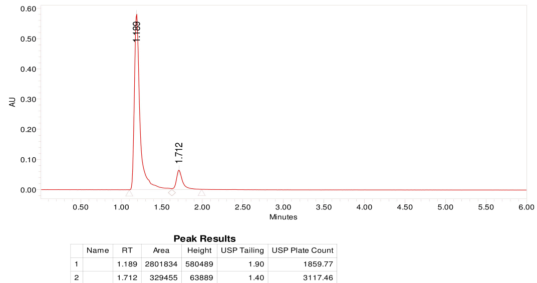 Chromatographic conditions the UPLC system consisted of 2695 separation module, autosampler and PDA detector. The wavelength of detection as set at 240 nm. Separation was carried out in dikma C18 (50×2.1 mm, 1.8 μ) and the retention time (RT) of metformin HCl and empagliflozinin was found to be 1.189 min and 1.712 min respectively shown in fig. 3, using mobile phase consisting phosphate buffer and methanol, pH 3.0 in the ratio of 30: 70 v/v at a flow rate of 1 ml/min with UV detection at 240 nm. The mobile phase was filtered through 0.45 µ filter under vacuum filtration [18, 19, 21].