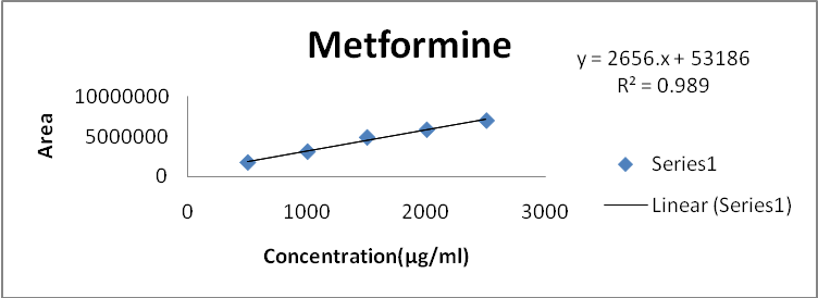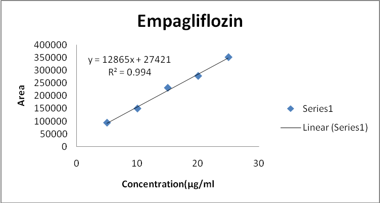 The measurement of linearity was evaluated by analyzing different concentrations of the standard solution of metformin HCl and empagliflozin. For both the drugs, the Beer-lamberts law was obeyed in the concentration range 500-2500 μg/ml and 5-25 μg/ml for metformin HCl and empagliflozin respectively. The linearity of the proposed UPLC method was constructed by considering concentration (μg/ml) on X–axis and peak area on Y-axis. The regression coefficient was considered to be 0.98 over a concentration range of 500–2500 μg/ml (MET) and 0.99 over a concentration range of 5–25 μg/ml (EMPA). The representative linearity equation was found to be y = 2656x+53186 (MET) and y = 12865x+27421 (EMPA) as showed in fig. 4 and 5 and the corresponding data were shown in table 4. For both the methods the % RSD was found to be within the acceptable theoretical limits of ≤ 2%, which meet the method validation acceptance criteria and hence the method was said to be linear for both the drugs.